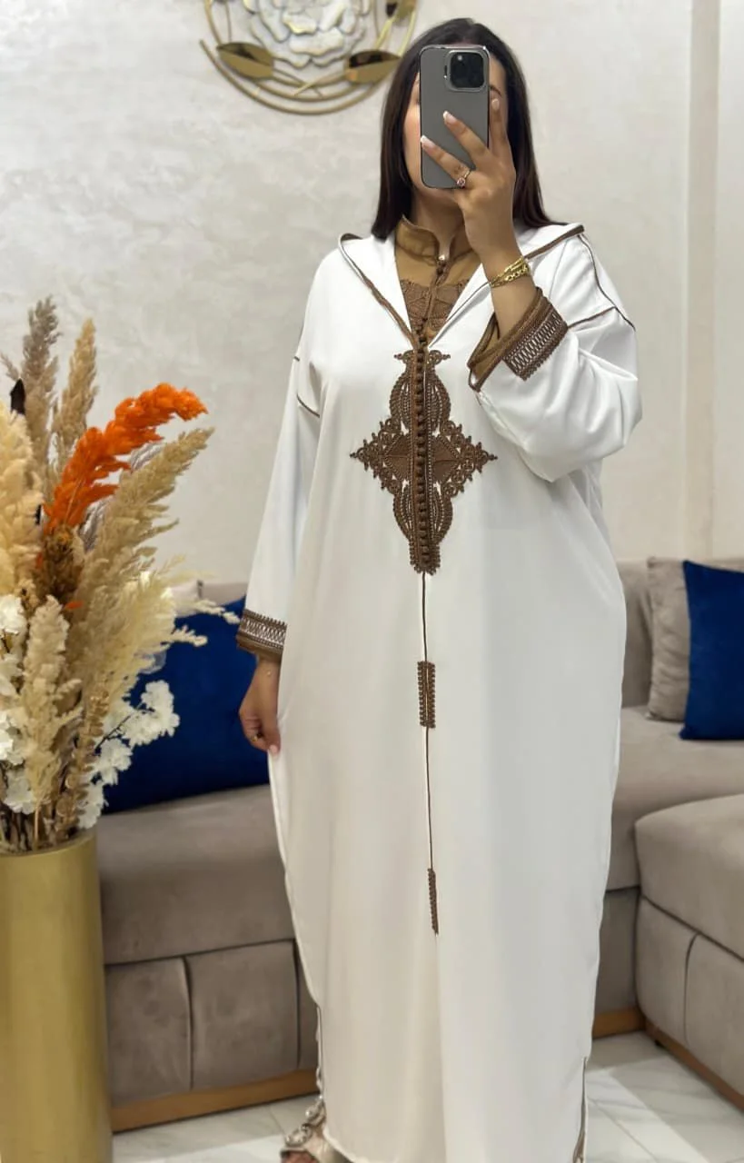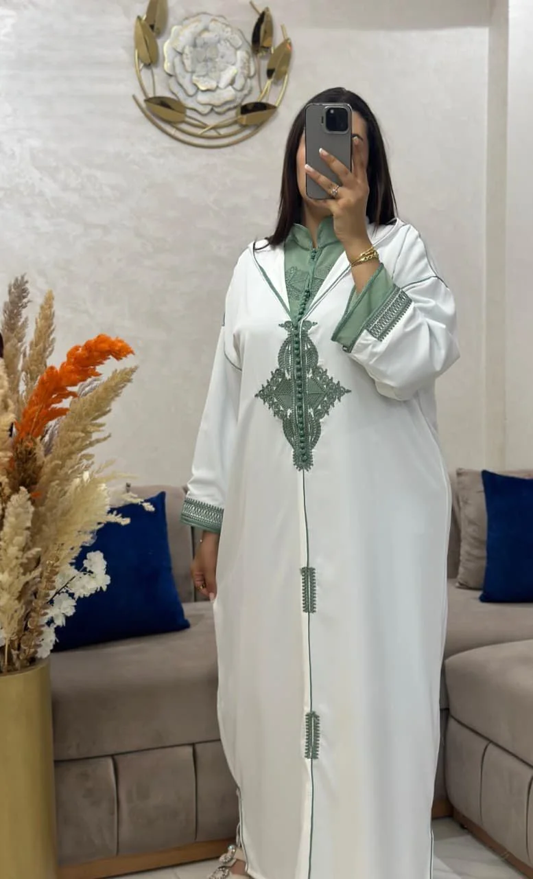 - تشطيب فائق الجودة على الأكمام والحواشي، مع "سكفّة" مغربية مطرزة بعناية.