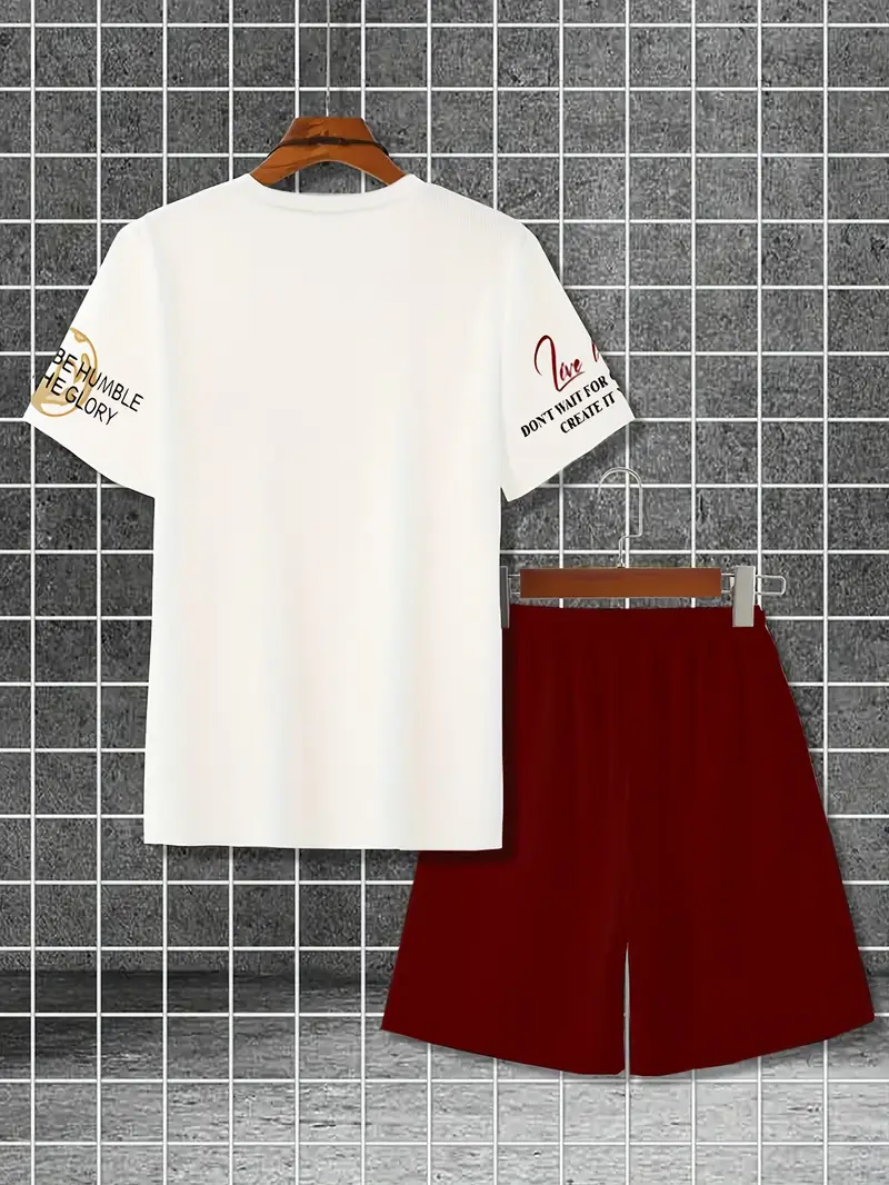الموديل: طقم رجالي مكوّن من تيشيرت أبيض واسع + شورت برغندي.